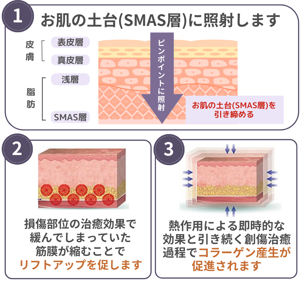 特殊な超音波を使ってお肌の深い層まで熱エネルギーを与え、たるみの根本原因であるSMAS(筋膜)を引き締め、創傷治癒過程(リモデリング)でコラーゲンが再生されることで、お肌の奥深くからリフトアップ効果が期待できる治療です❣️